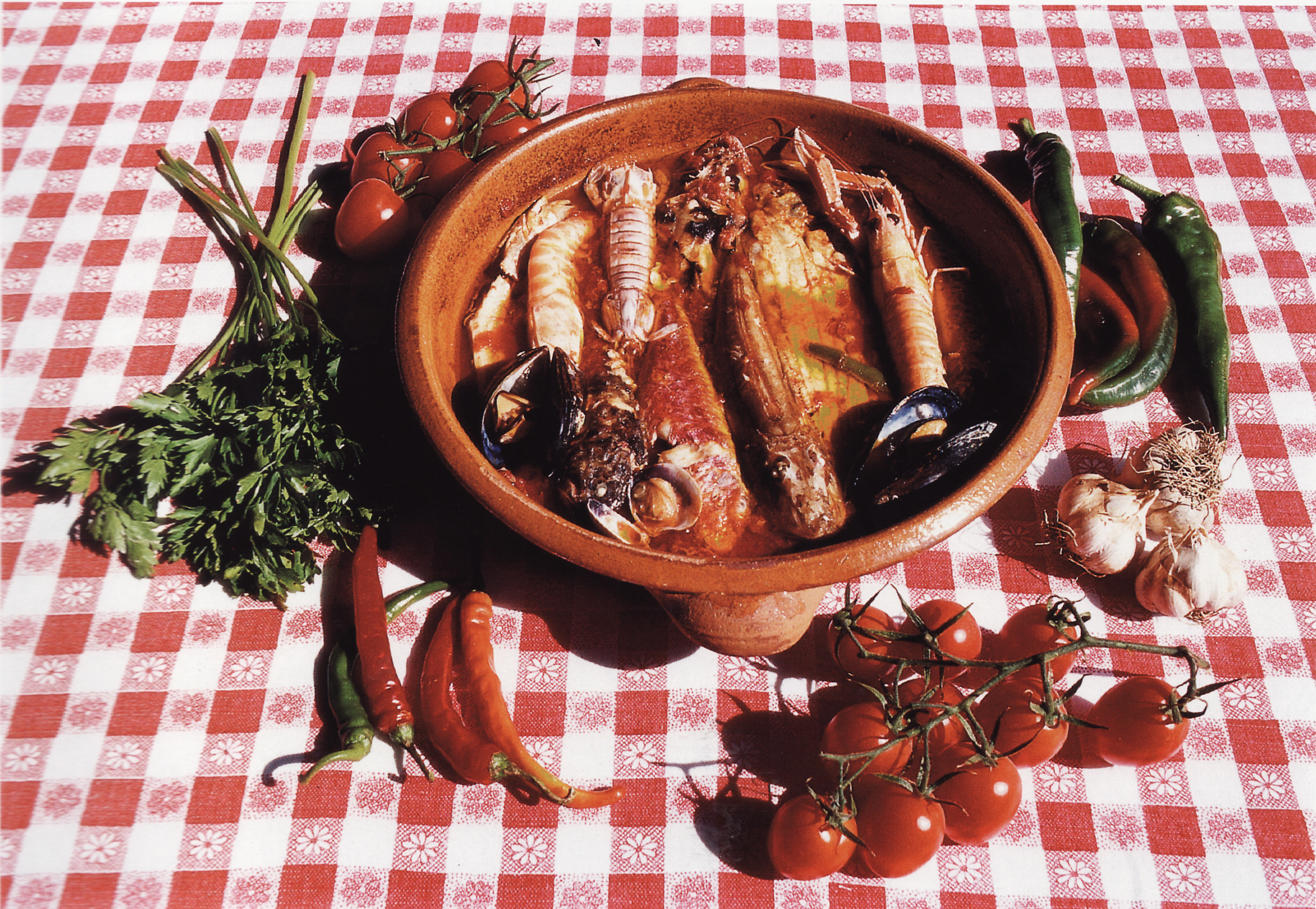 -Ingredienti: 1 Kg e 1/2 di pesce misto: sogliole, spigole, triglie, merluzzi ( se si riesce a trovare, anche pesce meno nobile, di scoglio), piccole seppie, panocchie (cicale) ed altri preferiti, tutti lavorati e puliti pronti per la cottura. 1 decilitro di olio extra vergine di oliva. 500 gr. di polpa di pomodori, cubettata. 100 gr.di cipolla e 4 spicchi di aglio tritati insieme. Un bel pugno di prezzemolo tritato grosso, un ciuffetto di basilico. Fette di pane fritte nell'olio. Sale. Abbondante peperoncino piccante.